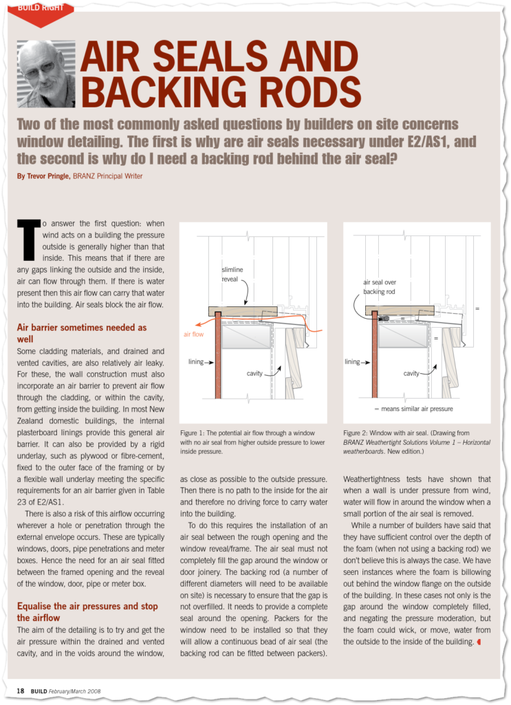 What about using polyurethane (PU) gun foam to seal this gap? I agree with the BRANZ Build Feb/March 2008 article that if the gap is completely filled, the foam itself could potentially wick water from the outside to the inside So, why use foam sealant in the first place? Because it’s a quick (and thus cheap) way to block the air flow through those inevitable gaps around penetrations like windows and doors. My main concern with foam, even with a backing rod, is durability when the building moves over time. Tapes and sealant plus backing rod (when installed correctly) can manage movement and I’m not sure that PU gun foam will stay sealed as well with the same amount of movement. This is why we usually specify tapes in our Passive House projects. That said we have had buildings use sealant plus backing rod with a skilled set of tradies to meet the Passive House air tightness requirements.