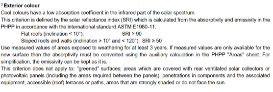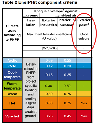 This property is so vital for overheating protection that the Passive House Institute (PHI) explicitly regulates it. The “2.2.1 EnerPHit criteria for the building component method” requires cool colours for hot and very hot climates. Note that this is a hard requirement only for the EnerPHit Component Method. Other certification tracks, such as the full Passive House Standard, simply require that the specific weathered absorptivity after 3 years of exposure, emissivity, and thermal conductivity be accurately modelled in the Passive House Planning Package (PHPP).