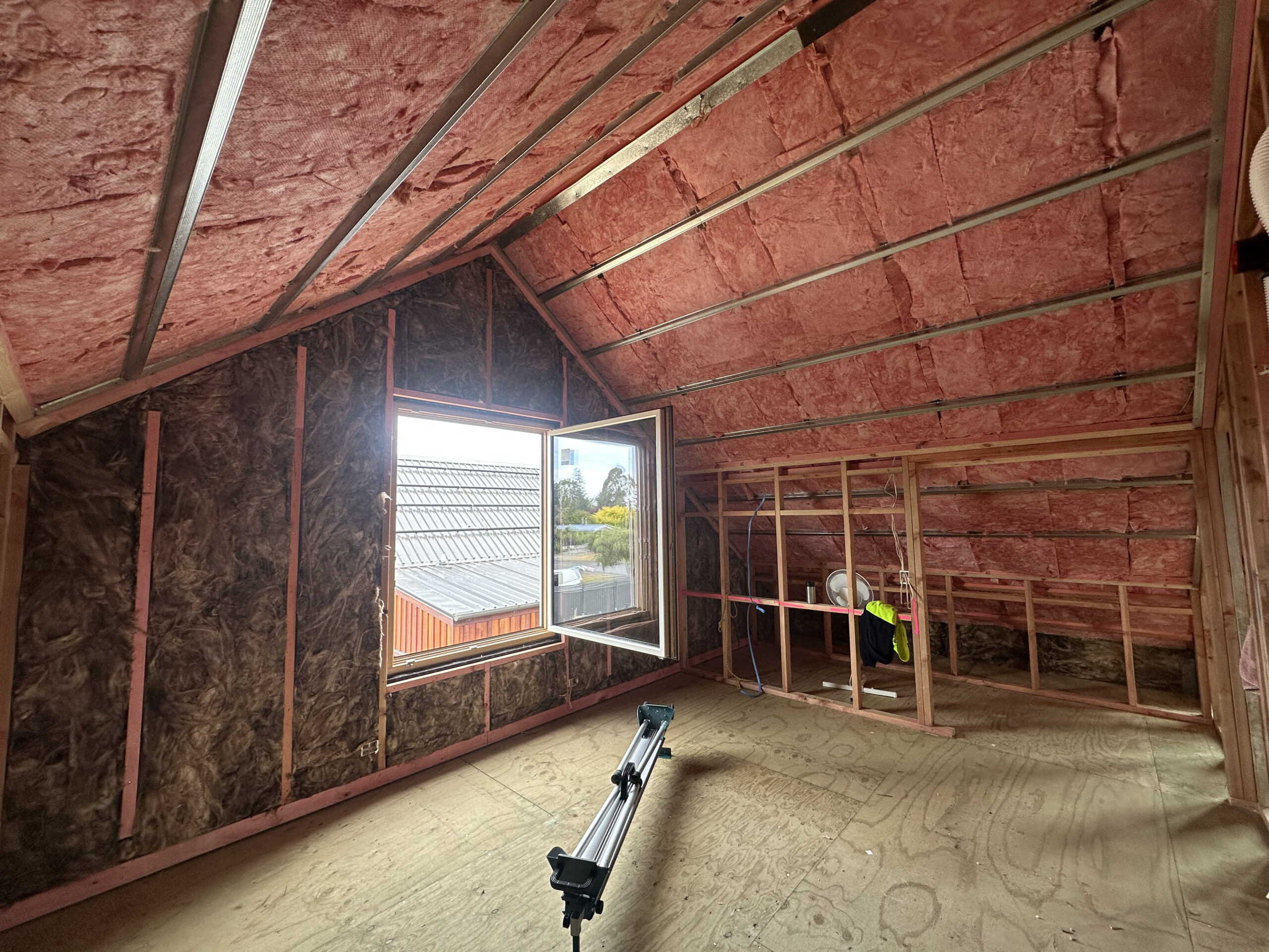 - Timber skillion roof with two layers of R4.3 Pink Batts