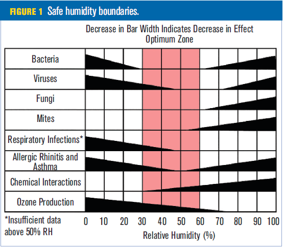 However, a recent article in ASHRAE Journal takes us forward in quantifying the health value of good indoor air quality. The article by Peter Luttik points to a growing body of research showing that keeping indoor relative humidity in the sweet spot of 40-60% drastically reduces the viability of bacteria, viruses, fungi and mites. This I knew.