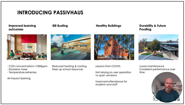 Ben Caine leads Leanhaus in Western Australia, an architectural firm that specialises in Passive House quality projects. His presentation was about classrooms he designed for an independent school—noteworthy in itself, given how desperately we need to improve the buildings in which kids are warehoused for many of their waking hours.
