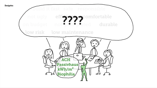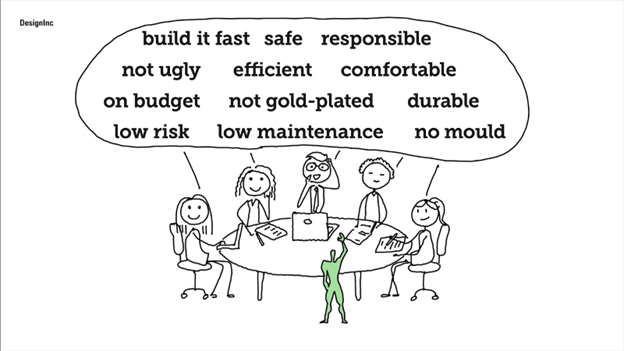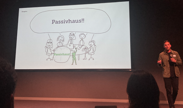Kieran talked about a specific, real project, a large residential development, but he wasn’t letting slip any identifying details. And never mind, because his argument is widely applicable. Every architect or designer knows the scenario: you’re brought onto a project, or have an opportunity to pitch or tender, you know Passive House is a no-brainer but it’s not part of the brief or even necessarily anywhere on the clients’ radar. You’re faced with a room full of people who have their own “whys”: