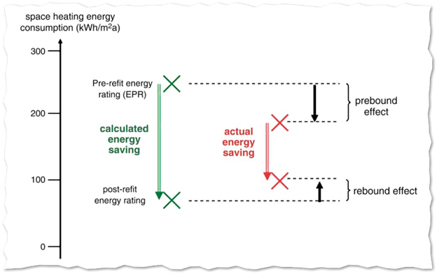 The combination of these two effects means the actual energy savings are often squeezed from both ends, as this schematic from Sunikka-Blank and Galvin’s paper neatly illustrates: