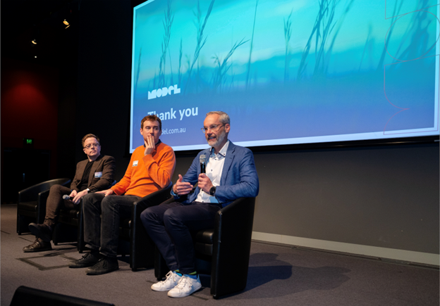 From R-L, Matt Mattiske (Model), Richard Stokes (Arup) and David Mahony (Hip v. Hype), sharing the keynote presentation at #Thrive2025. Image (c) APA